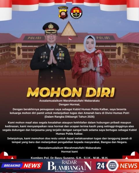 RADAR BLAMBANGAN.COM, | Pontianak – Masa penugasan Kombes Pol. Dr. Bayu Suseno, S.H., S.I.K., M.M., M.H., sebagai Kepala Bidang Hubungan Masyarakat (Kabid Humas) Polda Kalimantan Barat resmi berakhir. Kepindahannya untuk mengemban amanah baru di Divisi Humas Polri dalam rangka Pendidikan Pengembangan Spesialisasi (Dikbangti) Tahun 2026 menandai babak baru pengabdian perwira menengah Polri tersebut.
