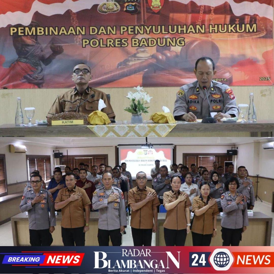 RADAR BLAMBANGAN.COM, | BADUNG, -– Dalam rangka meningkatkan profesionalisme dan pemahaman hukum bagi personel kepolisian, Tim Bidang Hukum (Bidkum) Polda Bali menggelar kegiatan pembinaan dan penyuluhan hukum di Aula Polres Badung, Kamis (6/11). Kegiatan yang dihadiri oleh puluhan personel Polres dan Polsek jajaran ini membahas materi utama terkait Peraturan Kapolri Nomor 1 Tahun 2025 tentang Pembentukan Peraturan di Lingkungan Polri, sebagai pedoman dalam pelaksanaan tugas yang sesuai ketentuan hukum.