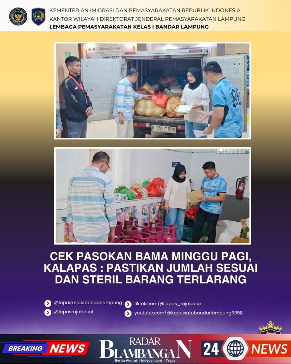 RADARBLAMBANGAN.COM | Bandar Lampung – Komitmen pelayanan dan pengamanan di Lembaga Pemasyarakatan (Lapas) Kelas I Bandar Lampung terus digalakkan tanpa mengenal hari libur. Pada Minggu pagi (4/1/2026), Kepala Lapas Kelas I Bandar Lampung, Ike Rahmawati, periksa langsung penerimaan logistik dapur. Ia turun tangan langsung memeriksa kedatangan bahan makanan (Bama) dari pihak penyedia (vendor) sebelum diolah menjadi menu harian warga binaan.