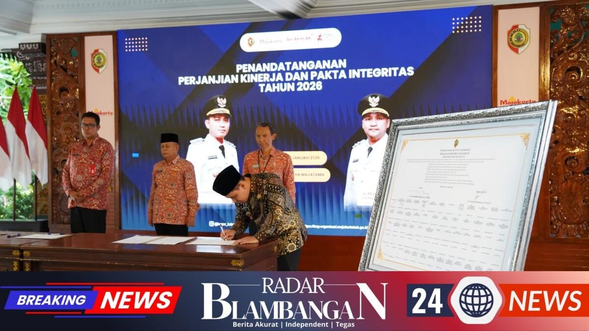 RADAR BLAMBANGAN.COM| Kabupaten Mojokerto – Pemerintah Kabupaten Mojokerto menggelar kegiatan Penandatanganan Perjanjian Kinerja dan Pakta Integritas Tahun 2026 yang sekaligus menjadi momentum Deklarasi Anti Korupsi. Acara berlangsung di Pendopo Graha Maja Tama (GMT) pada Kamis (22/1) sore, dengan dihadiri Bupati Mojokerto Muhammad Al-Barraa, Wakil Bupati M. Rizal Octavian, Sekretaris Daerah, para staf ahli, asisten sekda, kepala perangkat daerah, direktur RSUD, seluruh camat, serta kepala bagian di lingkup Setdakab Mojokerto.