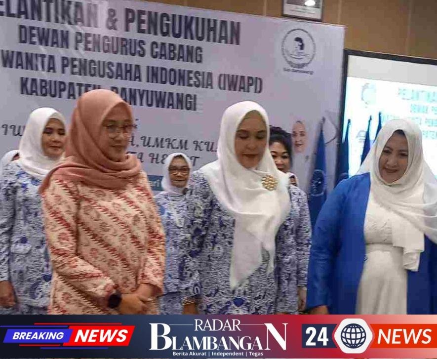 RADAR BLAMBANGAN.COM, | BANYUWANGI – Hj. Nina Kristanti Diani, SE resmi menahkodai Ikatan Wanita Pengusaha Indonesia (IWAPI) Kabupaten Banyuwangi periode 2026–2031. Pelantikan dilakukan oleh Dewan Pengurus Wilayah (DPW) IWAPI Jawa Timur dan dikukuhkan langsung oleh Bupati Banyuwangi, Ipuk Fiestiandani, di Hotel Illira, Kamis (5/2/2026), berdasarkan hasil Musyawarah Cabang (Muscab) sehari sebelumnya.