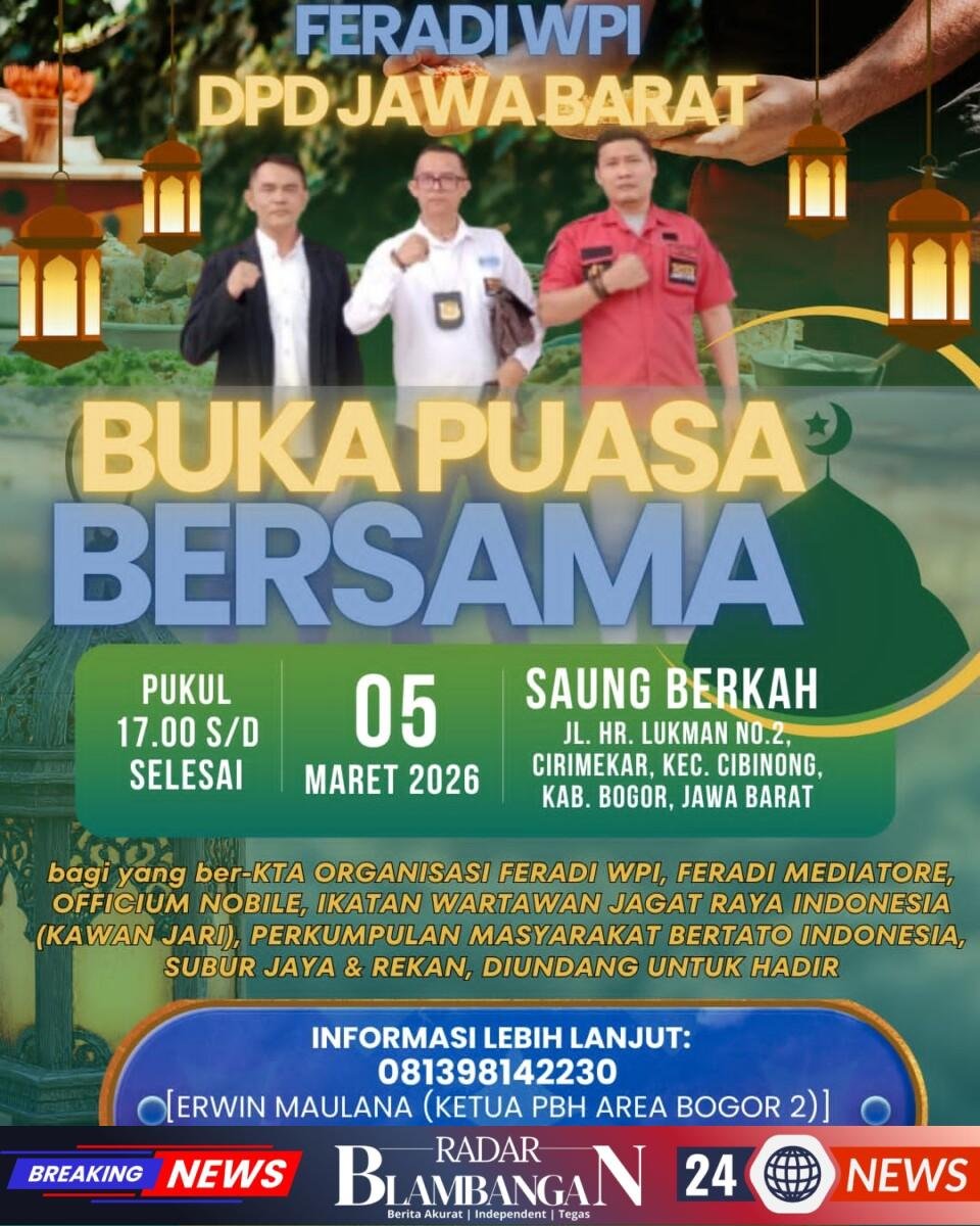 RADAR BLAMBANGAN.COM, | Jakarta, – Kamis 19 Feb 2026 ditemui awak media, Ketua Panitia Acara Buka Bersama DPP FERADI WPI – Bendum IV DPP Muhammad Adji Setiadji, S.H., C.PFW., C.MDF., C.JKJ. beserta P.I.C. BUKBER DPP FERADI WPI Waketum Revan Pratama Wijaya, S.H., C.PFW., C.MDF., C.JKJ., Menyampaikan bahwa DPD FERADI WPI Jakarta akan mengadakan Agenda buka puasa bersama di Hari Selasa 3 Maret 2026. Mulai pk.17.00 – Selesai. Bertempat di Resto Gubug Udang Situ Cibubur, Jalan Alternatif Cibubur Nomor 4, Kota Depok, Jawa Barat. Semoga acara ini bisa mempererat tali persaudaraan antar sesama anggota dan pengurus FERADI WPI seluruh Indonesia.