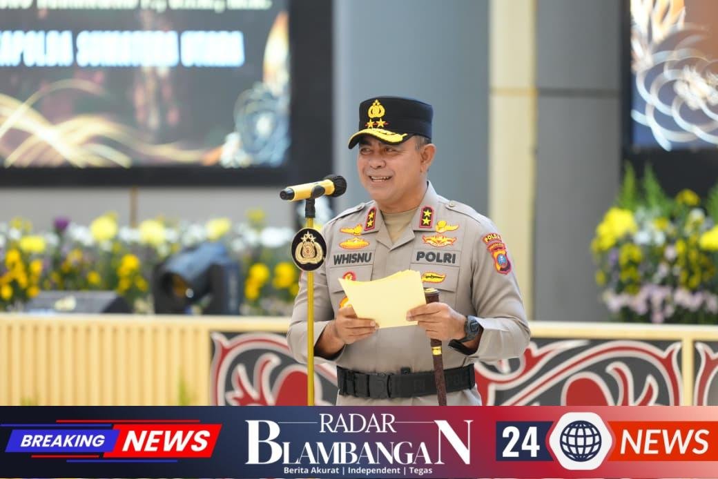 RADAR BLAMBANGAN.COM, | Medan — Kepala Kepolisian Daerah Sumatera Utara, Irjen Pol Whisnu Hermawan Februanto, S.I.K., M.H., memimpin langsung rangkaian serah terima jabatan (sertijab) dan pengukuhan Pejabat Utama (PJU) serta Kapolres jajaran Polda Sumut yang digelar di Aula Tribrata Lantai I Mapolda Sumut, Kamis (8/1/2026).