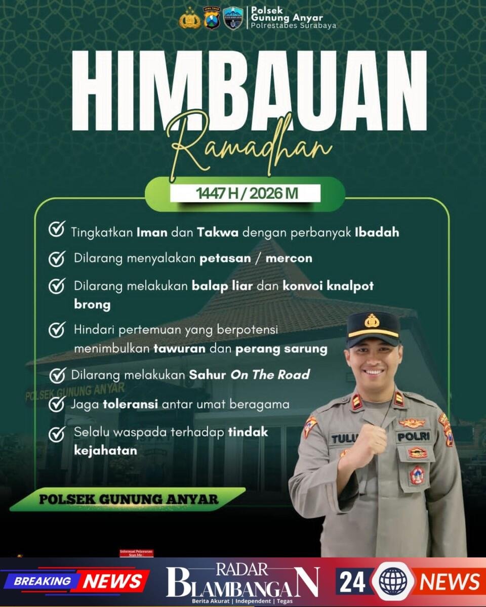 RADAR BLAMBANGAN.COM, | SURABAYA – Kapolsek Gunung Anyar Iptu Tulus Wibowo mengeluarkan himbauan kamtibmas selama Ramadhan 1447 Hijriah guna menjaga keamanan dan ketertiban masyarakat (kamtibmas) di wilayah Kecamatan Gunung Anyar, Kota Surabaya