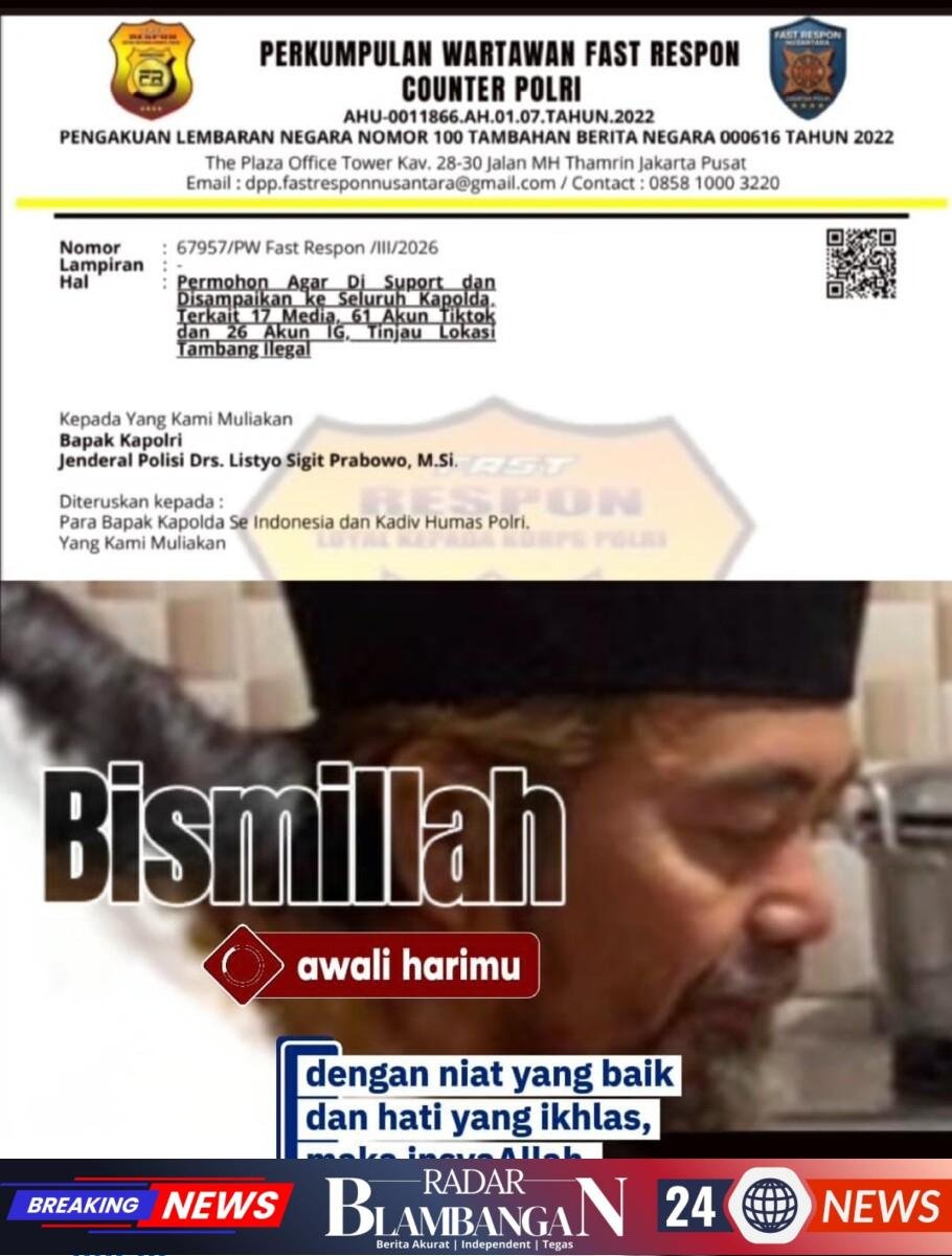 RADAR BLAMBANGAN.COM, | Jakarta – Ketua Umum Persatuan Wartawan Fast Respon Nusantara (PW-FRN), Agus Flores, akhirnya melayangkan surat resmi kepada Kapolri terkait dugaan carut-marutnya penegakan hukum terhadap praktik tambang ilegal di Indonesia.