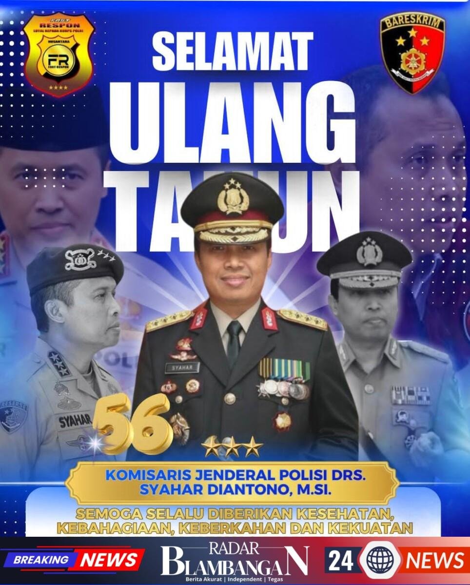 RADAR BLAMBANGAN.COM, | Jakarta, – Ketua Umum Perkumpulan Wartawan Fast Respon (PW-FRN), Agus Flores, beserta seluruh jajaran pengurus pusat dan daerah menyampaikan ucapan selamat ulang tahun yang ke-56 kepada Komisaris Jenderal (Komjen) Pol. Drs. Syahar Diantono, M.Si.