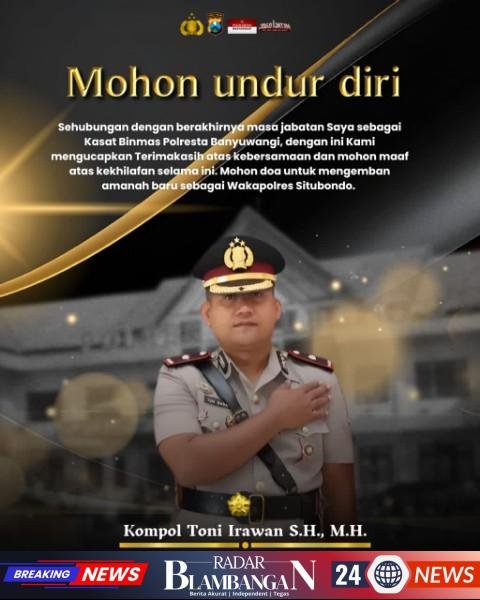 Melalui pesan terbuka yang disampaikan kepada Kapolresta Banyuwangi, Wakapolresta, para Pejabat Utama (PJU), serta seluruh Kapolsek jajaran Polresta Banyuwangi, Kompol Toni menyampaikan rasa terima kasih yang mendalam atas kebersamaan, dukungan, dan sinergi selama menjalankan tugas.