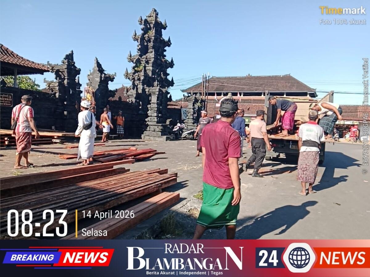 RADAR BLAMBANGAN.COM, | Menjelang pelaksanaan piodalan besar Usaba Sri di Desa Adat Bungaya, Kepolisian Sektor (Polsek) Bebandem melalui jajaran Bhabinkamtibmas menunjukkan komitmennya dalam mendukung kearifan lokal. Hal ini terlihat saat Bhabinkamtibmas Desa Bungaya, Aiptu I Komang Gede, terjun langsung membantu warga dalam giat kerja bakti pengangkutan kayu di wilayah Aci, Kecamatan Manggis, Selasa (14/04/2026).