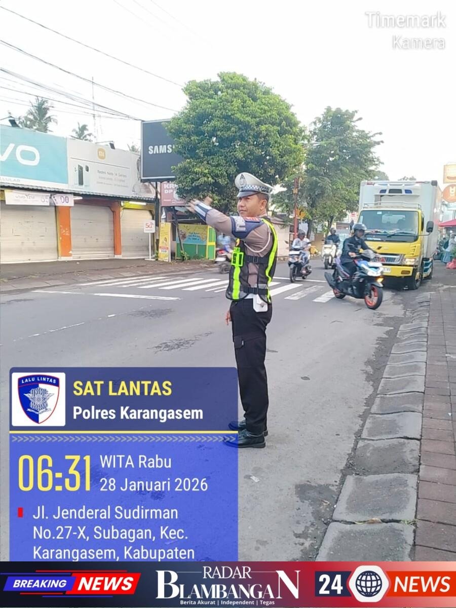 RADAR BLAMBANGAN.COM , | KARANGASEM, –– Satuan Lalu Lintas – Pada hari Rabu, 28 Januari 2026 sekira pukul 06.30 Wita demi menjaga keamanan dan kelancaran arus lalu lintas di BTN Taman Asri, personil satuan Lalu Lintas Polres Karangasem yang sudah disprinkan bertugas gatur pagi, tetap dengan semangat dan ikhlas serta berbekal rasa tanggungjawab tinggi melaksanakan tugas pemantauan, pengaturan dan penjagaan arus lalu lintas serta dapat membantu menyeberangkan masyarakat pengguna jalan yang melintas di seputaran terutama pada jam – jam padat arus lalu lintas di pagi hari pada jalan masuk sp. 3 BTN Taman Asri Amlapura.