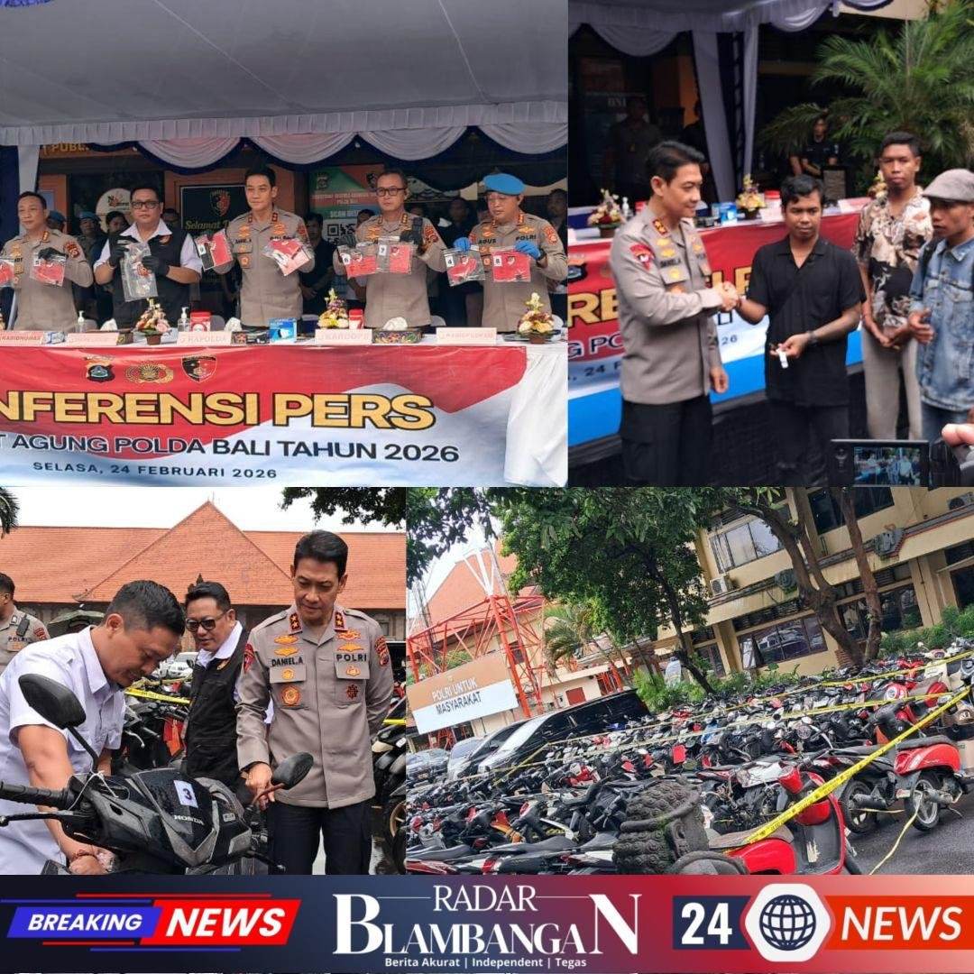 Charalnews.com , | DENPASAR – BALI, – Polda Bali menggelar Konferensi Pers Ops Sikat Agung 2026 dan hasil giat rutin Gakkum pada hari Selasa, 24 Februari 2026, di Lobby Direskrimum Polda Bali. Konferensi pers ini dipimpin langsung oleh Kapolda Bali, Irjen. Pol. Daniel Adityajaya, S.H., S.I.K., M.Si., dan dihadiri oleh pejabat-pejabat tinggi Polda Bali, yaitu Kabid Humas Polda Bali, Kombes Pol Aryasandy, SIK, Direskrimum, Kombes Pol. Dr. I Gede Adhi Mulyawarman, S.I.K., S.H., M.H, Karo Ops, Kombes Pol. Soelistijono, S.I.K., M.H., Kabid Propam, Kombes Pol. I Ketut Agus Kusmayadi, S.I.K., S.H., M.H.