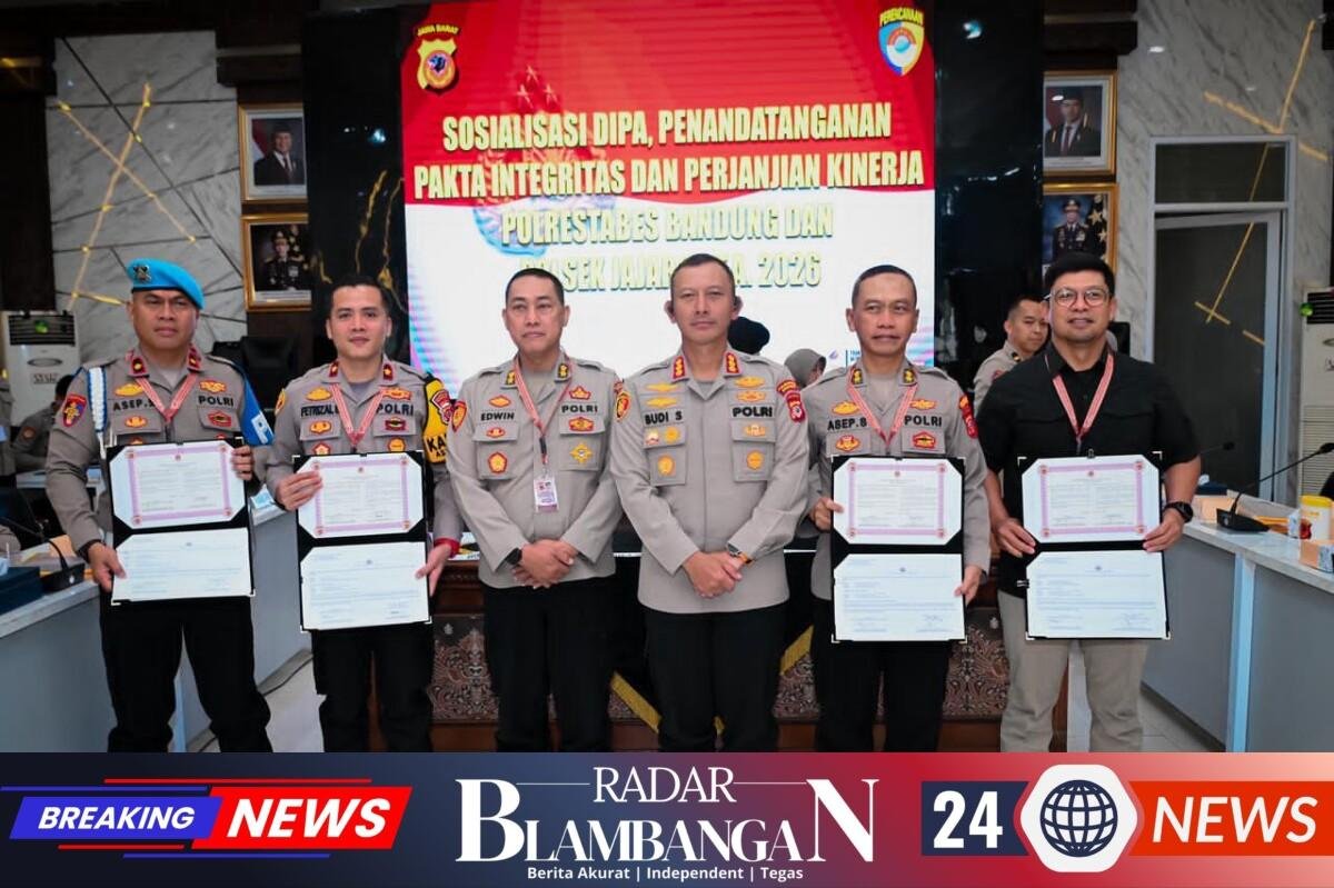 RADAR BLAMBANGAN.COM, | Bandung, – Kepolisian Resor Kota Besar (Polrestabes) Bandung menggelar kegiatan Sosialisasi Daftar Isian Pelaksanaan Anggaran (DIPA) Rencana Kerja dan Anggaran Kementerian Negara/Lembaga (RKA-KL) Tahun Anggaran (TA) 2026. Kegiatan yang berlangsung di Aula Polrestabes Bandung pada Kamis (22/1/2026) ini dirangkaikan dengan penandatanganan Pakta Integritas serta Perjanjian Kinerja.