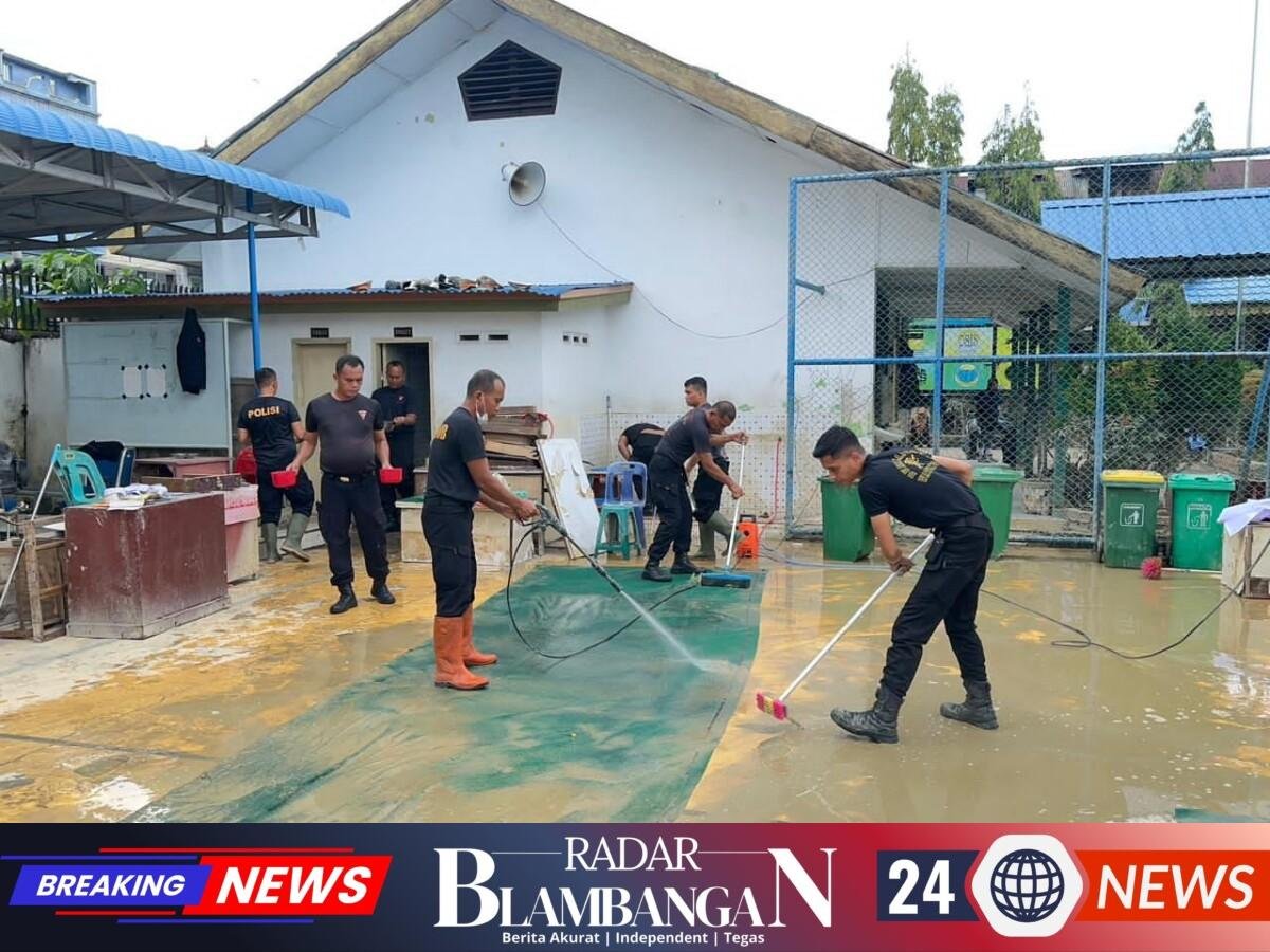 RADAR BLAMBANGAN.COM, | Langkat — Personel Satuan Brimob Polda Sumatera Utara melaksanakan kegiatan pembersihan lingkungan sekolah yang terdampak banjir di SMA Negeri 1 Tanjung Pura, Kabupaten Langkat, Minggu (28/12/2025). Kegiatan ini difokuskan pada ruang kelas, halaman sekolah, saluran drainase, serta fasilitas penunjang pendidikan lainnya yang dipenuhi lumpur, sampah, dan sisa material banjir, guna memulihkan kondisi sekolah agar dapat kembali digunakan oleh para siswa dan tenaga pendidik.