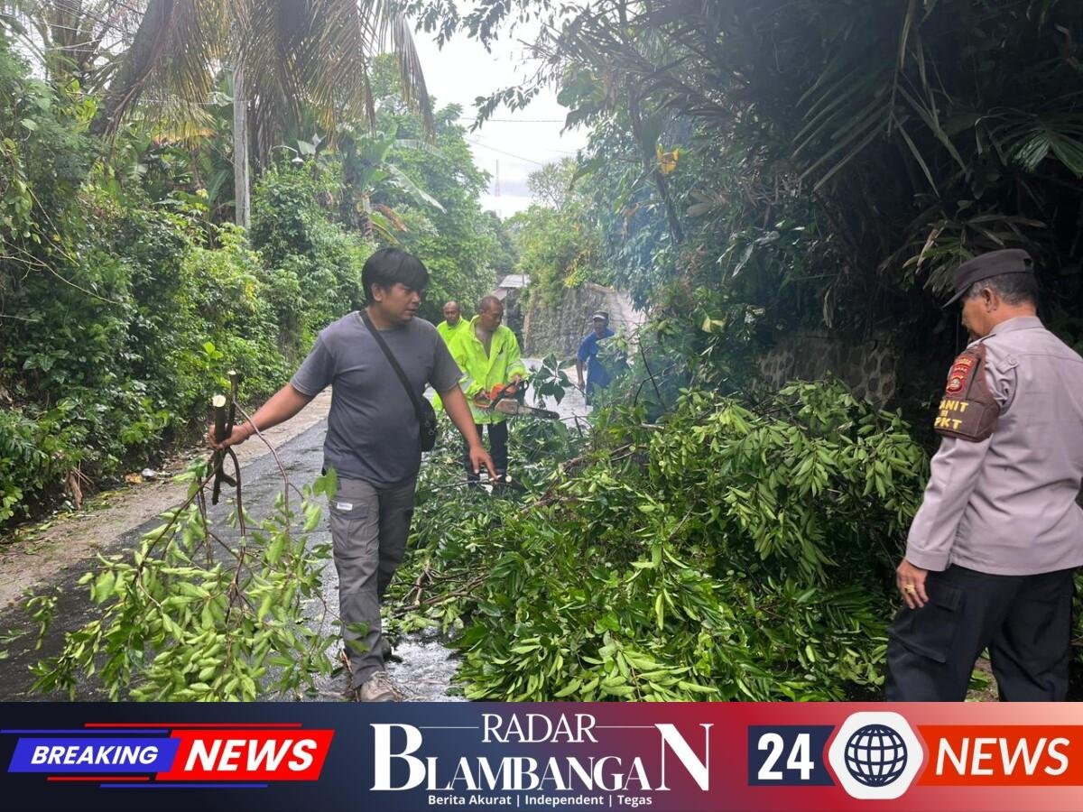 RADAR BLAMBANGAN.COM, | KLUNGKUNG, -– Personel Polsek Banjarangkan bersama masyarakat bergerak cepat menangani kejadian pohon tumbang jenis Awar-awar yang berada di sisi utara jalan Tanjakan Simpang 3 SKB menuju Pasar Tusan–Banjarangkan, Klungkung , ( 14/11).