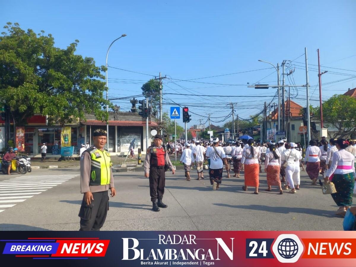 RADAR BLAMBANGAN.COM, | Gianyar – Personel Polsek Gianyar melaksanakan pengamanan kegiatan Upacara Adat Melasti Desa Adat Serongga menuju Pantai Lebih, Kecamatan Gianyar, pada Minggu (15/3/2026) pagi. Pengamanan dilakukan untuk memastikan rangkaian upacara adat yang diikuti ribuan krama tersebut dapat berlangsung dengan aman, tertib, dan lancar.