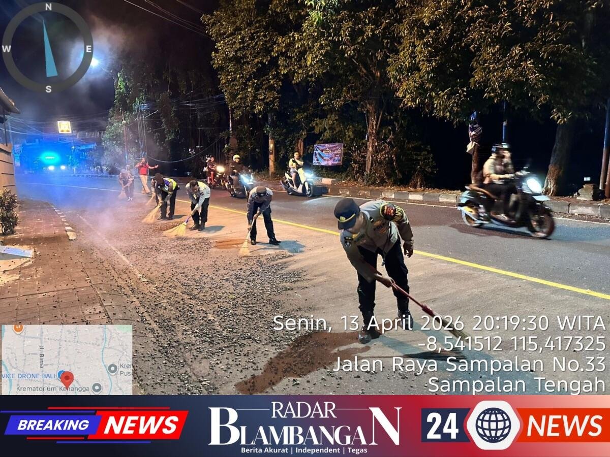 RADAR BLAMBANGAN.COM, | Polres Klungkung – Menindaklanjuti aduan masyarakat melalui layanan call center Polri 110, personel Polres Klungkung bersama Polsek Dawan bergerak cepat melakukan pembersihan ceceran material koral di jalan raya wilayah Desa Sampalan Tengah, Kecamatan Dawan, Kabupaten Klungkung, (13/4).