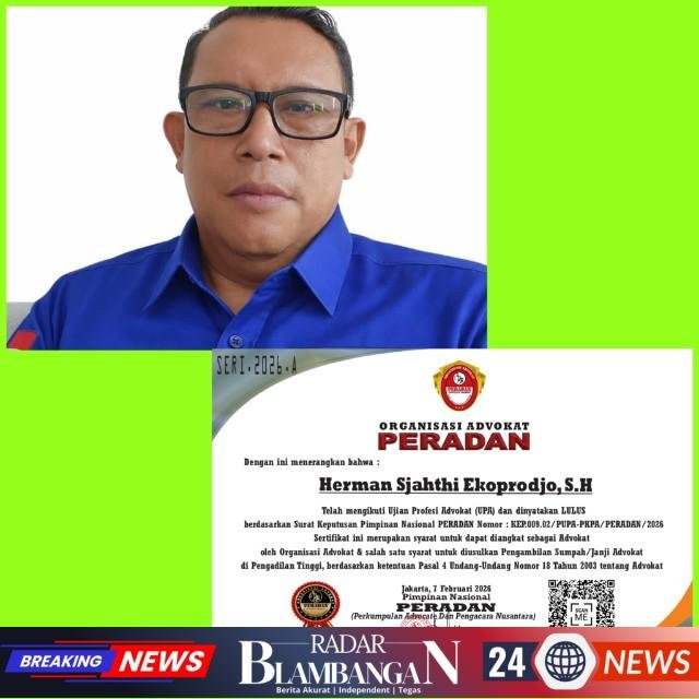 RADAR BLAMBANGAN.COM, | JAKARTA – Kabar membanggakan datang dari dunia hukum tanah air. Herman Sjahthi Ekoprodjo, S.H resmi dinyatakan lulus Ujian Profesi Advokat (UPA) yang diselenggarakan oleh Organisasi Advokat PERADAN tahun 2026.