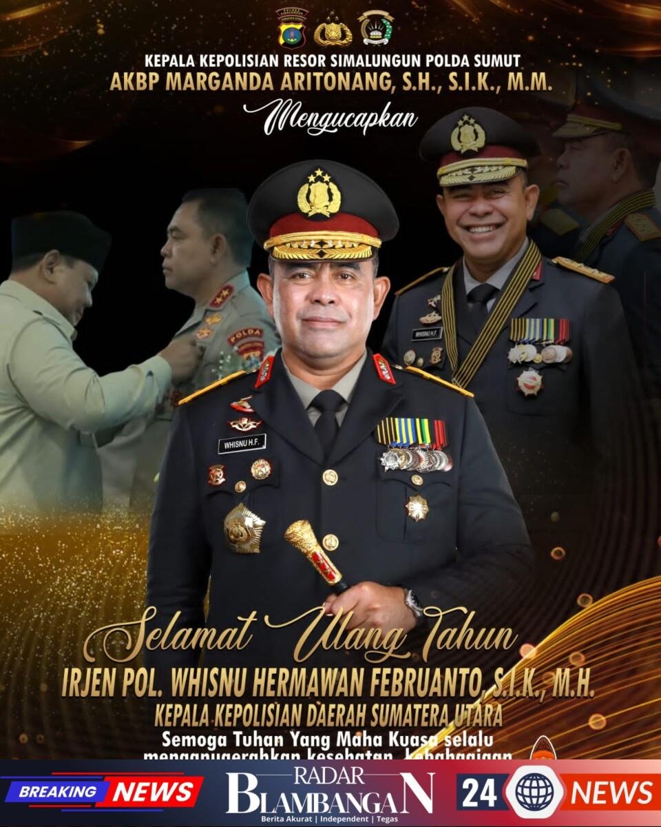 RADAR BLAMBANGAN.COM, | SIMALUNGUN – Kehangatan ucapan selamat ulang tahun menyelimuti jajaran Polres Simalungun untuk sang pemimpin tertinggi Polda Sumatera Utara. Kapolres Simalungun AKBP Marganda Aritonang beserta seluruh staf dan Bhayangkari mengucapkan selamat ulang tahun kepada Kapolda Sumut Irjen Pol Whisnu Hermawan Februanto yang merayakan hari kelahirannya yang ke-54.