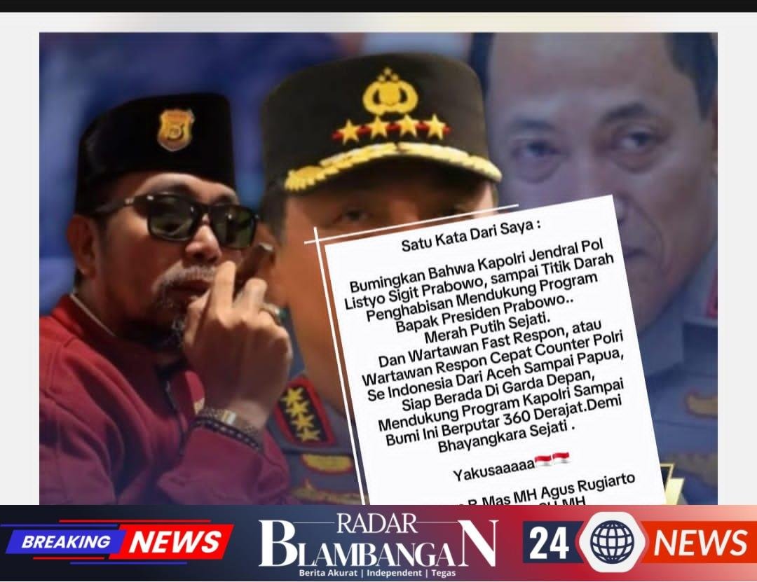 RADAR BLAMBANGAN.COM, | Jakarta, – Komitmen kuat dalam mendukung arah kebijakan nasional kembali ditegaskan oleh jajaran Wartawan Fast Respon di seluruh Indonesia. Dalam pernyataan tegasnya, Ketua Umum Fast Respon, R. Mas MH Agus Rugiarto Sastrodiarjo, SH., MH., menyerukan semangat totalitas kepada seluruh elemen wartawan untuk berdiri di garis terdepan mengawal kinerja Kapolri Listyo Sigit Prabowo.