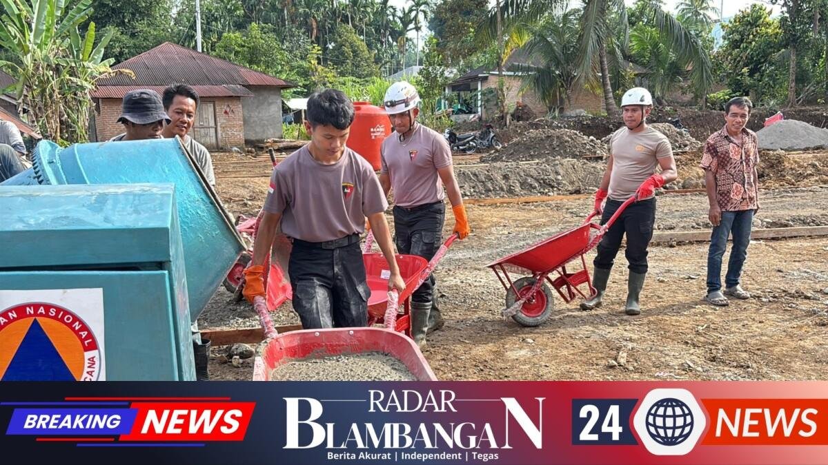 RADAR BLAMBANGAN.COM, | Sumatera Barat – Tim SAR Resimen II Pasukan Pelopor BKO Polda Sumatera Barat melaksanakan kegiatan kemanusiaan berupa normalisasi aliran sungai sekaligus mendukung pembangunan Hunian Sementara (Huntara) bagi warga terdampak banjir bandang di Desa Kampung Tengah, Kecamatan Palembayan, Kabupaten Agam, Rabu (21/1/2025).