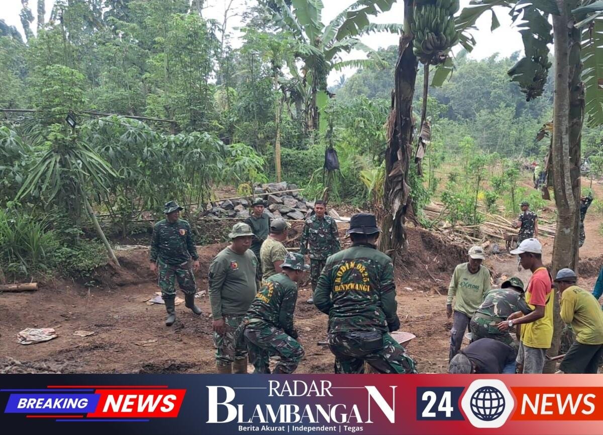 RADAR BLAMBANGAN.COM, | Bangorejo – Semangat kebersamaan antara TNI dan rakyat terlihat nyata di Desa Sambirejo, Kecamatan Bangorejo, pada Selasa (27/1/2026). Personel Koramil 0825/10 Bangorejo, Sertu Erwantoyo, bersama warga setempat dan personel gabungan dari berbagai Koramil bahu-membahu dalam karya bakti pembangunan Jembatan Perintis Garuda Merah Putih. Infrastruktur ini menjadi proyek vital yang menghubungkan akses transportasi langsung antara Kecamatan Bangorejo dan Kecamatan Siliragung guna mempermudah mobilitas ekonomi serta sosial masyarakat di kedua wilayah tersebut.